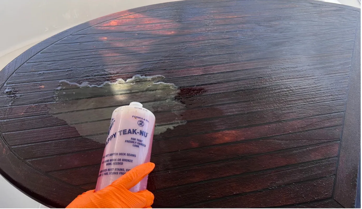 Our journey began with a couple of YouTube video demonstrations of Snappy Teak-Nu, sparking our curiosity to test it out on our heavily weathered teak table. When we went to the local marine surplus and chandlery in Daytona Beach, Florida, one of the employees even commented: “That’s what all the super yacht guys use.” We figured we must be on the right track.