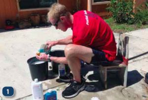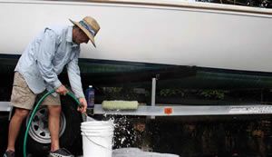 * Work from the top of the boat down. Lather up, scrub, and rinse. Knock off the job in sections. If you lather up the entire boat, portions could dry before you get to them.