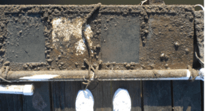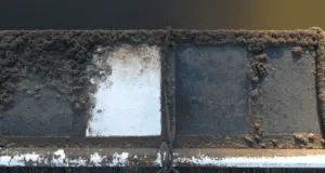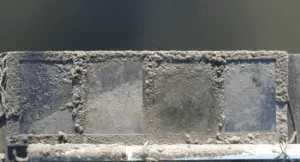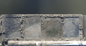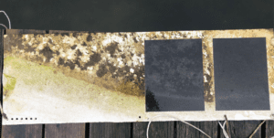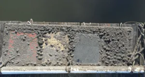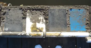 After one year of immersion, the most aggressive growth were soft marine-invertebrates and algae creeping in from the edges. All panels had at least a thin layer of slime. Photos don’t necessarily tell the whole story. When evaluating panel performance, testers focus on the center of the panel, as marine life can gain a foothold along the unprotected edge and migrate inward. Darker colors can also camouflage light fouling, making these paints appear more effective. Hard growth has not yet overtaken any panels.
