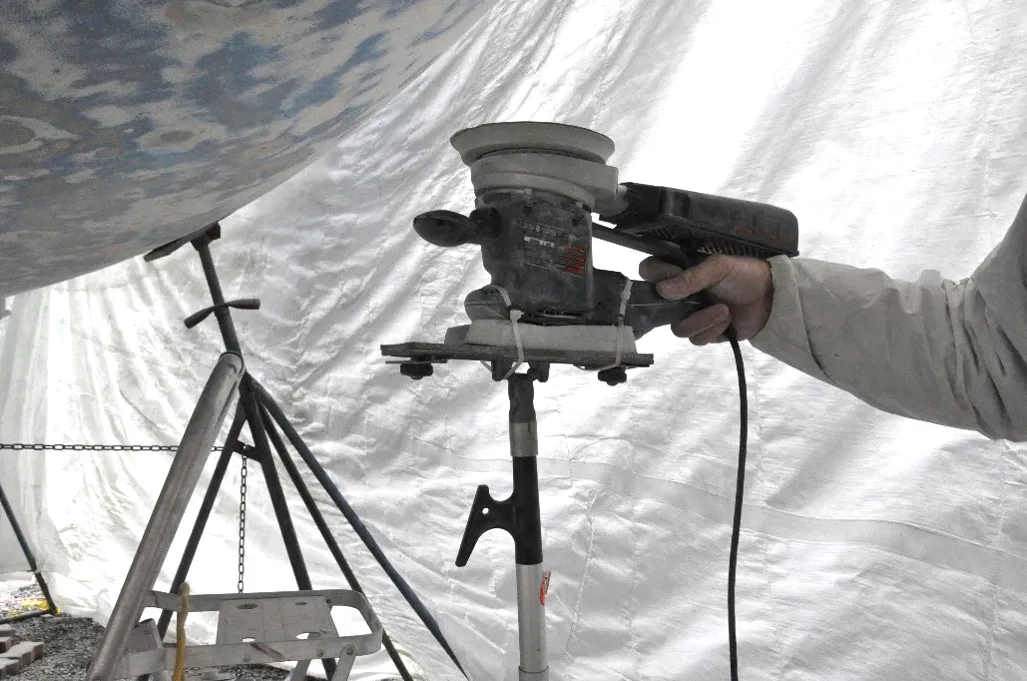 An inventory of available weaponry showed a Makita 4-in. grinder, a Milwaukee 4-in. belt sander and a Bosch 6-in. orbital sander. I suspected the grinder and belt sander would rapidly remove more material than I wanted. There was potential for leaving surface damage. The lighter Bosch had speed control, would be less aggressive and, although slower, would leave a better finish. The Bosch would be the tool of choice, working from 60 to 120 grit paper. However, even the lighter Bosch was more than I could hold over my head hour after hour. It’s amazing how much area is involved in a 30 ft hull!