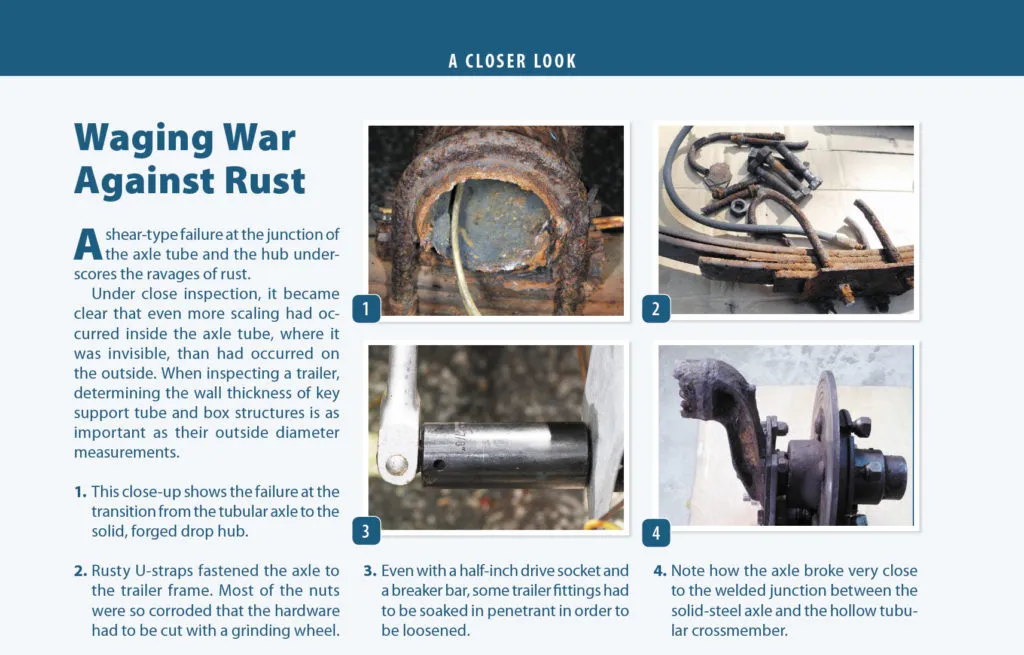 Naranjos trailer trauma stemmed from one omission. For years, he carried out routine maintenance, but he neglected to consider the wall thickness of the axle tube. The tube was thinner than he thought, and it corroded from inside and out. Although the forged, drop spindles were solid steel, they were welded to a tubular crossmember that should not have been allowed to rust. The outcome was embarrassing, but it could have been a lot worse, had it happened at highway speed.