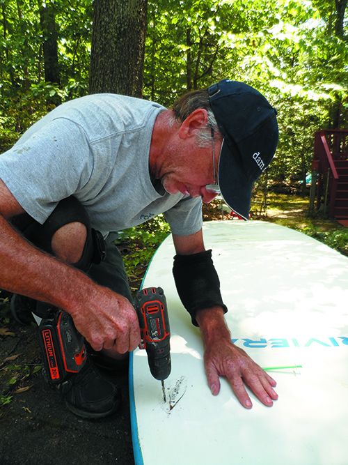 We used a single row of five injection points because we thought the moisture-trigger expansion would cause the Gorilla Glue to spread farther. Although not as strong as epoxy, the Gorilla Glue foam is very high density and is much stronger than injection foams. However, it spread only 0.5- to 1-inch in each direction, so additional holes should increase the strength proportionately. We used a closer spacing when repairing the paddleboard.