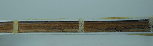 We bonded fiberglass skins to both new and uniformly rotten plywood to create test coupons. The rotten plywood was dry when bonded, because the core would have been dry when first created. After they had cured, we soaked them for a day and then allowed them to dry for two days before moving on to injections. We also laid-up a virgin balsa core coupon for comparison. We then injected the rotten samples with a variety of adhesives. Both the controls and the test samples were then tested for stiffness and strength.