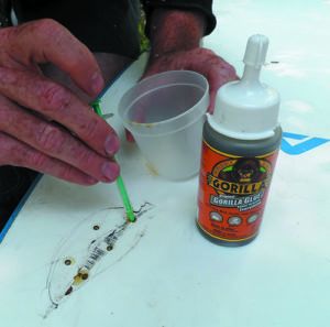 On vertical surfaces, angle the drill downwards so that the glue won’t just run out. Use a clamp-on drill-stop on the drill; you don’t want to drill into the cabin, although if you do, just slap some duct tape on the underside. You need to drill all the way through the core to insure maximum penetration, but you don’t want to puncture the inner skin.