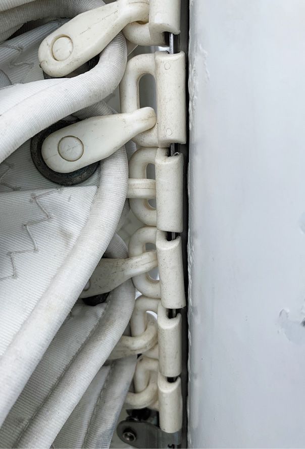 Luff hardware. On smaller boats, nylon sliders or slugs on the mainsail luff are a potential weak point. The slippery nylon reduces friction as they slide on the mast track, but a sudden load can break the slider bail—the u-shaped eye on the slider where the sail attaches. Ronstan and Bainbridge make slugs with stainless-steel bails, and these are preferable. For external and internal sliders, reinforced All-Slip sliders from Bainbridge are a good choice. A tightly fitted sail cover will prevent premature failure. Plan on replacing luff slides every three years—even though they can last longer. When the first one fails, replace them all.