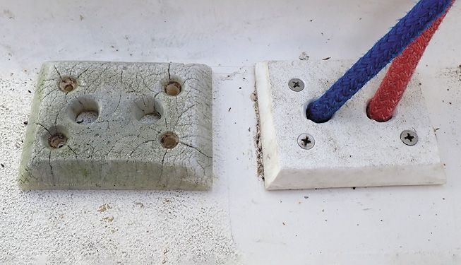 Backing plates. We sometimes see boats with Starboard-brand plastic backing plates. While the material won’t rot, it will gradually creep. This will cause the bolts to loosen, leaks to appear, and if the deck core has not been sealed, delamination and deck rot will follow. Fiberglass is our preferred material for backing plates. Stainless steel and aluminum are both good options, but stainless steel is expensive and aluminum can corrode.