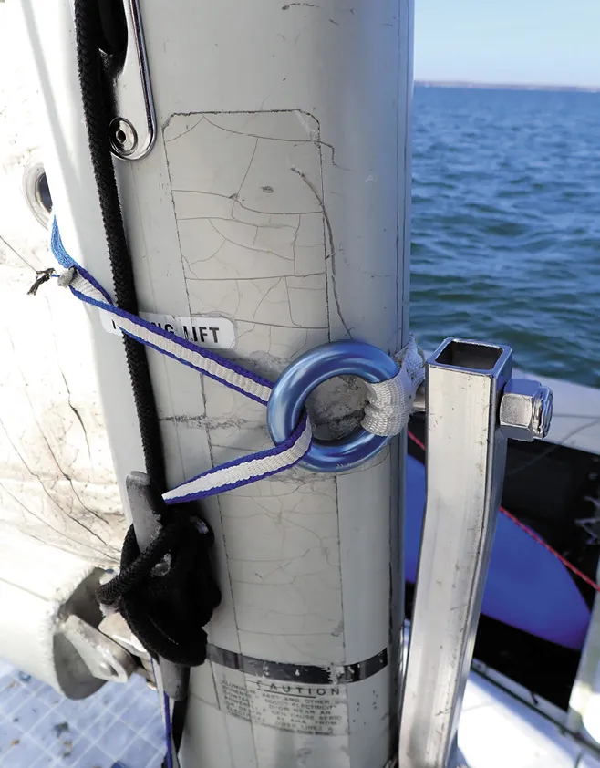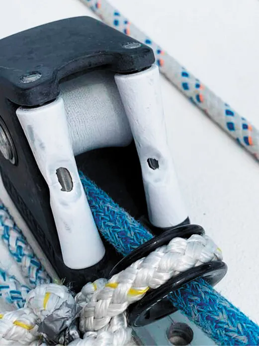 High-load blocks. We’ve experienced crushed plastic bearing and sheaves in several high-load turning blocks, all related to halyards. While we are fans of composite blocks for applications where light weight and low friction are a priority, metal is preferred for high-load blocks. Very high-load blocks—masthead sheaves, genoa leads, and some deck organizers are better served by non-ball bearing systems with primarily metal parts. Low friction rings can serve as turning blocks, but you will need to limit the number of turns and use slippery Dyneema rope, with covered tails for grip and handling as needed.