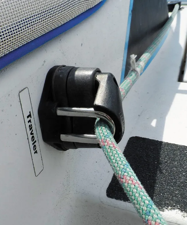 Leach-line cleats. Typically made of nylon, leach-line clam cleats are light, cheap, and don’t corrode to leave stains on the sails. But they are vulnerable to UV damage and often don’t last as long as the sail. They are good for racing and smaller sails, but on larger boats we prefer aluminum leach-line cleats.