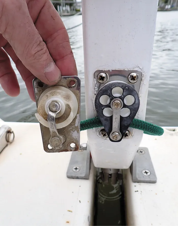 Masthead sheaves. The advantage of a plastic sheave is that it requires no bearings, so there is no chance of seizing, and there is less halyard wear. The disadvantages are that it will eventually crack, the result of UV damage. Plastic sheaves are acceptable on boats up to about 35 feet, but they should be replaced every 10 years. If you have metal sheaves, clean and lubricate them every few years. Ignore them at your peril. The last thing you want is for the halyard to jump out of its sheave and become jammed when you need to reef.