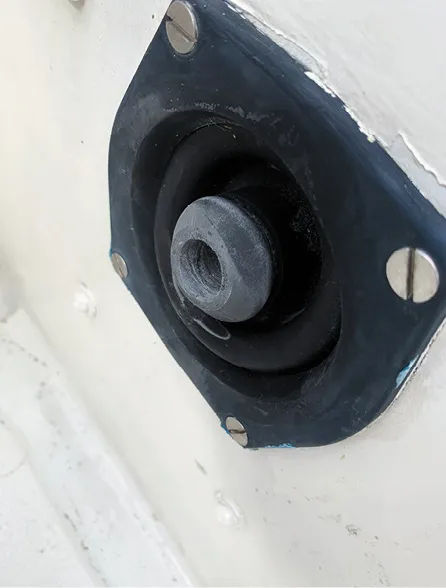 Through-hulls. Plastic through-hulls have their converts. We’re on the fence. Marelon and TruDesign through-hulls can provide reliable service, but white-nylon through-hulls do not have sufficient UV protection. You can expect white nylon through-hulls to fail within 5-10 years. Some plastic through-hulls are shaded by plastic clamshells, but if the clamshell falls off or is removed, they become vulnerable.