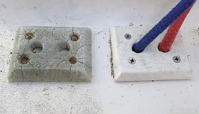 Backing plates. We sometimes see boats with Starboard-brand plastic backing plates. While the material won’t rot, it will gradually creep. This will cause the bolts to loosen, leaks to appear, and if the deck core has not been sealed, delamination and deck rot will follow. Fiberglass is our preferred material for backing plates. Stainless steel and aluminum are both good options, but stainless steel is expensive and aluminum can corrode.