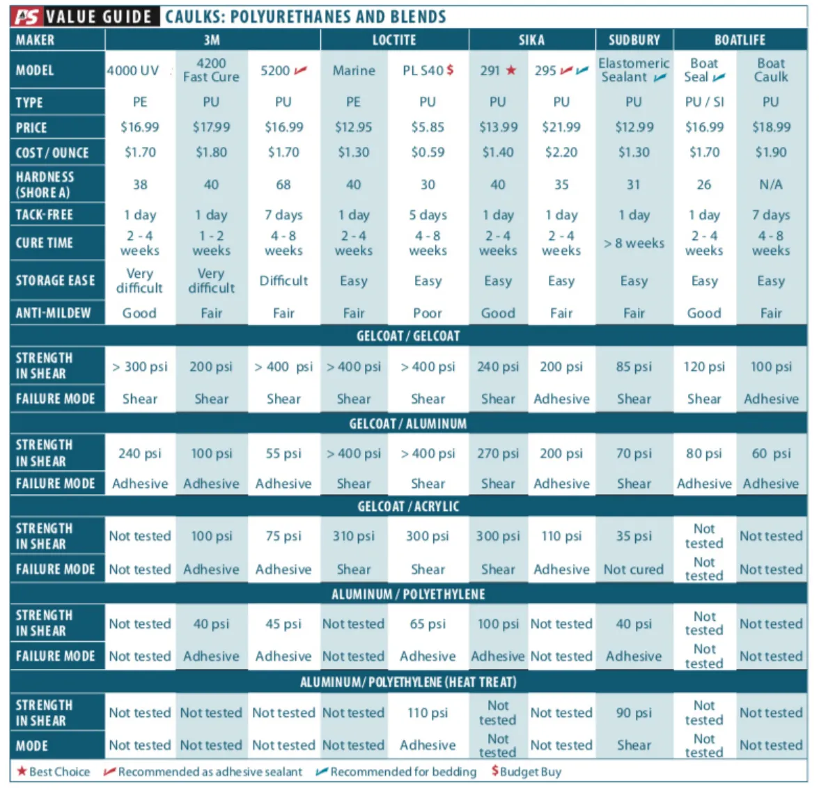 A correction to your Table: Boatlife Boat Caulk is a Polysulfide (similar to 3M 101), not a Polyurethane.