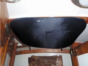 Traditional methods of bug-proofing the forward hatch include screens that either attach to the underside of the hatch (using Velcro or some similar arrangement) or are draped over the top of the open hatch. Weve used the latter option on our test boat for a number of years, but always found it a minor pain to have to go topsides to remove it. Waterline Designs net and blackout screen feature a cord and suction cup arrangement that allows you to attach them quickly and easily from downbelow, inside the cabin. The cord is attached to the suction cup, runs through a grommet in the center of the screen, then through an adjustable clamp. To install it on our test boat, we simply opened the V-berth hatch, attached the suction cup to the underside of the hatch glass, then secured the mosquito net in place by sliding the adjustable cord clamp up tight against the bottom of the net, creating a slight bow in the fabric. It was simple to install and stayed firmly in place.
