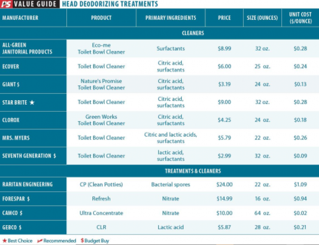 Modern head treatments are based on nitrates, surfactants, and enzymes, in a variety of formulations. What they have in common is that they reduce odors in the holding tank without any side effects, and if used in the bowl, treat the bowl and hose against smells, and slowly, and naturally help clean the bowl. A number of companies that make holding tank treatments (Camco, Forespar, Pure Oceans, Raritan) also make head cleaning formulations and they seem to know what they’re doing.