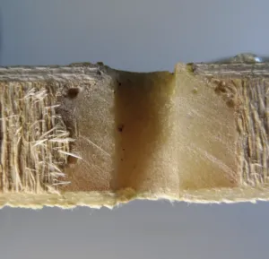 • Pop out the core and clean out the hole using a bent roofing nail or small chisel. You do not have to carve core from under the edge of the inside skin, just clean the edges of the hole and underside of the top skin.