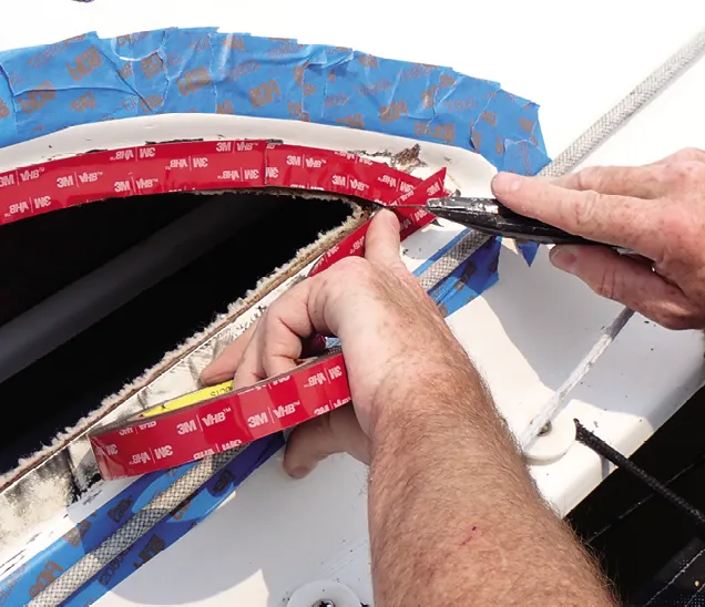 If the surface is very smooth and non-porous, proceed directly with VHB tape. Old, porous gelcoat should be primed with 3M Tape Primer 94. It dries in less than 15 minutes and provides a slick, impermeable surface that will maximize VHB bonding. Extend the primer under the entire area that the sealant will cover. Do this shortly before applying the tape. Also, if you mask the perimeter of the frame at this time with 3M blue painter’s tape, you won’t have to tape again for the sealant step.