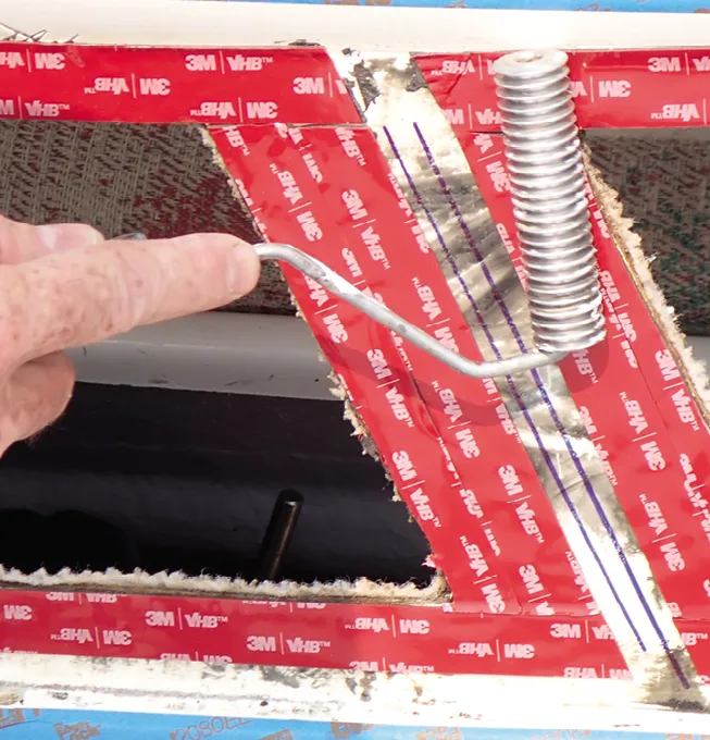Unless you have used 3M’s primer, wipe the frame one last time with alcohol. Apply a ¾-inch strip of VHB tape around the inside rim of the frame. Trim as needed with a razor blade. Roll the tape firmly into place with its cover strip still in place. A fiberglass laminating roller or wallpaper seam roller works well. It takes several days for VHB tape to reach full strength, but after 20 minutes it will achieve a good bond.