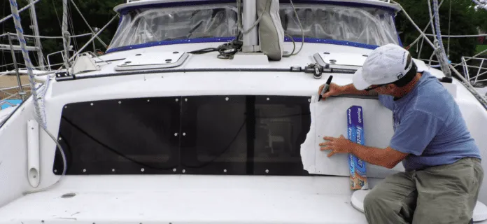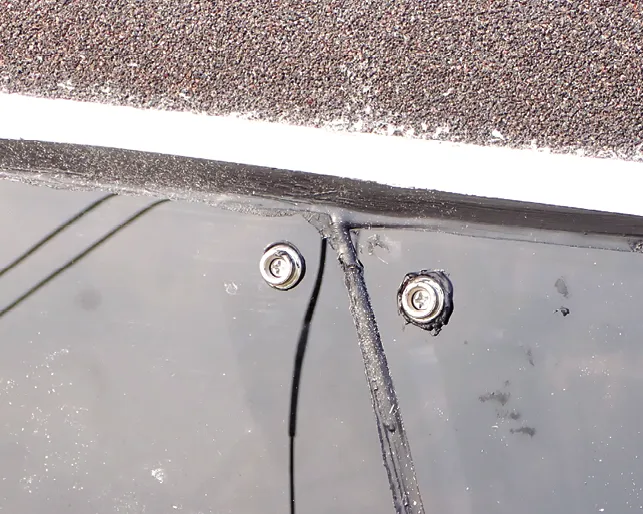 Fasteners offer backup retention in the event of sealant failure. Placed in the corners, they are also convenient for attaching window covers, which protect the new windows from UV, scratches, and bird bombs. We used screws to fasten the windows on our previous test boat, a PDQ catamaran. The seals lasted for more than 20 years, so I was confident we could use them again on the F-24.