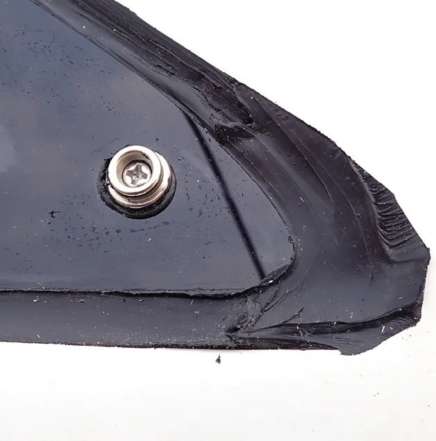 Install the screws. No more than finger tight to avoid stressing the plastic. A cone of sealant under the head prevents leaks.