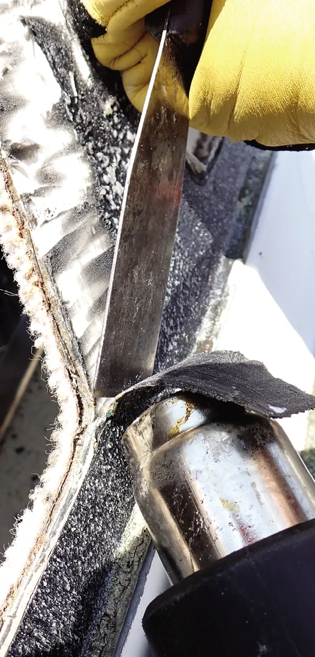 Before removing the old window, tape a tarp to the inside of the cabin. Lots of dirt and pieces of old sealant are going to fall in during the removal and cleaning process. My starboard window was loose and came off with the lightest encouragement from a putty knife. The port window required a much more aggressive approach, but eventually a pair of sharpened drywall knives did the trick. If the sealant is particularly stubborn, try a remover. We found Debond Marine Formula works well for removing all traces of silicone and Re-Mov is excellent for loosening polyurethane (see PS Tests Silicone and Adhesive Removers, PS January 2017). Slit along the bond line with a razor knife as deeply as possible, apply, and let soak for 10 minutes. Repeat.