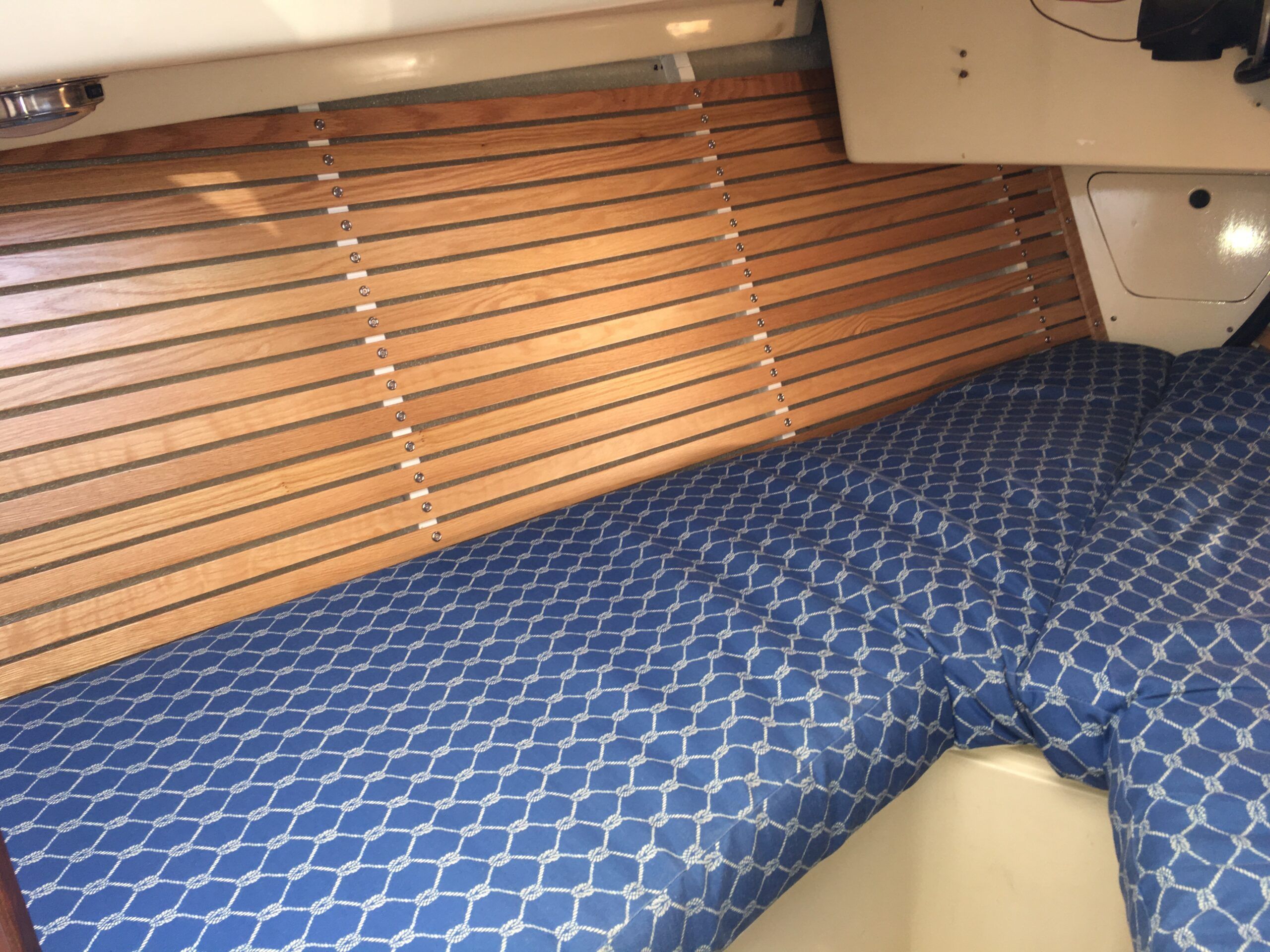 The question was: replace it with what? Once the fabric, usually vinyl, or carpet was pulled away from the fiberglass the lack of finish detail was again apparent. Painting was an option but a marginal improvement, the bare fiberglass prone to sweating profusely in our damp Pacific Northwest environment. Something that looked nautical and provided a degree of insulation would be much more acceptable. The proposal put forward was to have wooden strips running fore and aft with half inch closed cell foam behind it, fastened to the fiberglass as a insulating layer.