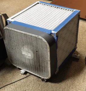 The cheapest high volume fan is a common box fan (about $20). They’re quiet and move air at about 2,000 cfm. Conveniently, they are also 20-in. x 20-in., which is a good match up to 20-in. x 20-in. MERV 14 furnace filters, which are commonly sold in six-packs.