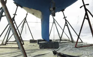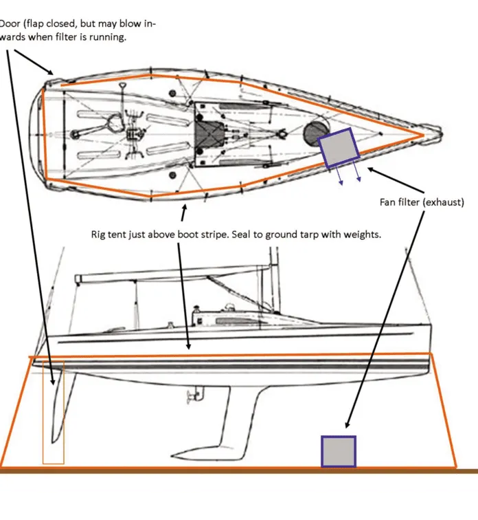 Facing a messy combination of scraping, sanding, and grinding that a vacuum sander can’t manage? For a short job, buy a 10-ft. x 100-ft. roll of 4 mil plastic sheeting from the big box hardware store for $65. Reinforce the top edge with duct tape and a length of clothes line, and secure to the toerail or suspend some distance lower. Secure the bottom edge with boards or cinderblocks, and obviously, tarp the ground. Overlap the ends to form a door on the downwind side, and tape the fan/filter combo into the sidewall at the opposite end, to create a one-way draft.