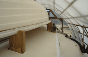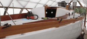 I built new cockpit coamings from 7/8” thick African mahogany. I finished them bright but trimmed the tops with bare teak. I reused the original damaged teak coamings, ripping them into lengths I scarfed them together and incorporated them into the cap rails used on the new coamings and on the bulwarks. Teak is rot resistant and because it’s not varnished it absorbs abuse varnished wood could never withstand.
