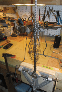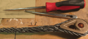 Stainless steel 7×7 does not need to be wormed, parceled, or served. I practiced making splices in the evenings with cheap 7×19 galvanized wire following the instructions in the late Brion Toss’ book The Rigger’s Apprentice. It took a few tries, but I figured out the basics. I then bought a roll of 316 SS 7×7 5/16” wire made in Europe and 24 bronze Merriman thimbles and went to work.