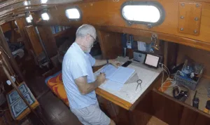 My navigation choices reflect my philosophy of what brings me enjoyment—using my brain as best I can and relying on equal parts art and science. Thus, I installed no dedicated chart plotter. I carried then, as I do now, paper charts, a Garmin GPS 76, and HO 249 Volumes 1-3, an almanac, and my sextant. Before I singlehanded back to North Carolina from St. Maarten, I installed a Vesper Watchmate 850 AIS transceiver. Although I occasionally use the iNavX navigation app on my iPad mini, my real focus is celestial navigation.