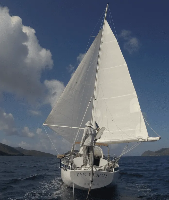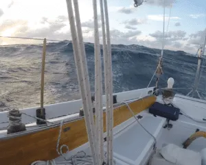 I’ve always enjoyed the timelessness of hauling-up sails hand over hand. It’s still exhilarating to hoist the jib, hear the whooshing bow wave, and feel the boat come to life while the wind-vane reliably steers the boat. Sure enough, handling the hank-on jib while singlehanding offshore at night is not for the faint of heart. Like most difficult tasks it’s mostly a technique driven skill. Sailors have done it since time immemorial. And, pulling off a sail change under difficult circumstances even when no one is watching is still immensely rewarding. There are downsides though, which will be discussed in the final series installment.