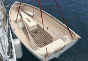 I have cruised with hard and inflatable dinghies. I hands down prefer a hard dinghy. It does not go flat, is seldom targeted by thieves, it creates opportunity for physical exercise, and it can be used with a sailing rig. We have owned a 9-foot Fatty Knees for almost 20 years. As described in Part 3, we stow and secure Sweet Pea inverted on the cabin top, aft of the mast, on dedicated chocks. To stow the sailing rig I fabricated leathered boots and rings which I whipped to the aft lower shrouds to hold the upper and lower end of the dinghy mast and boom vertically. Most people never notice them even when they walk down the side deck. With the dinghy along side we simply lift the mast up out of its boot and lower it into the dinghy mast partner. Nothing could be simpler. We bolt the rudder and daggerboard together and stow them ‘thwartship wedged between the dinghy gunwales with the bagged sail on this temporary shelf. The oars are strapped inside the dinghy. If necessary, the dinghy and its sailing components can be quickly launched from the cabin top as a single unit (see “Making the Dinghy Decision,” PS March 2021).