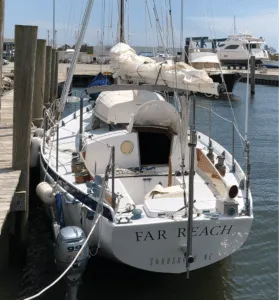 We purchased an 8.6-oz. main with four full battens and two reef points, an 8.6-oz. staysail with two reef points, a 616 sf 1.5-oz. drifter, a 9-oz. trys’l, and a unique 8.6-oz hank-on genoa with a lower bonnet that would zip off to turn the sail into a working jib. We saved money by eliminating the furler, and our hank-on jib performs better and maintains its shape longer than a roller reefing jib. A hank on jib will also never fail you. I sold the 25-year-old Harken furler unit that came with the boat.