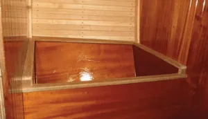The remaining 70 gallons are located in the bilge in three tanks. We use classic Fyn-Spray brass galley pumps mounted at the galley and head sink. There are no electric pumps aboard. With the exception of the 20-gallon tank in the cockpit locker all the tanks are filled by running a hose from a DIY Baja filter (see PS March 20150. There is one deck fill to the tank in the locker as it’s directly under the side deck. I plumbed the tanks with ½” trident potable hose, simple plastic hose barbs, and PVC ball valves. I used PEX and Shark-bite couplings for the vent lines. The entire walnut cabin sole can be removed in five minutes. The tanks can be removed and sitting on the dock in 45 minutes. We wash the bilge out with a hose every year to keep the boat clean and smelling fresh.