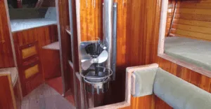 We installed a stainless steel Refleks MK 66 heater with cast iron top mounted low just forward of the starboard settee and vented through a 70 mm flue to an on-deck smoke head. It’s jetted for kerosene instead of diesel since kerosene is what we carry on the boat. It is gravity fed from a 10 gallon tank in the starboard locker. Next to the watch seat is a pet cock installed in the kerosene fuel line used to fill our kerosene interior lamps and nav lights.