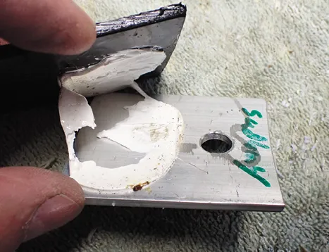 We used 150 grit sandpaper to remove the oxide film and immediately primed the metal with 3M Tape Primer 94. The other bonding surface was gelcoat. Without primer, the tape easily peeled away from the aluminum. With primer, the bond held, but the tape’s foam core sheared.