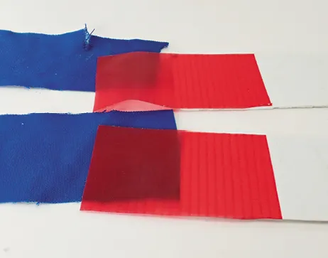 We tested 3M Tape Primer 94 on repairs of used Sunbrella and used polyester sailcloth (tradename “Dacron”) with Bainbridge Sail Repair Tape. Without a primer, tape does not stick to Sunbrella, but after applying the primer, the tape bond was strong enough to tear the Sunbrella during the shear strength test. On polyester sailcloth, the primer improved peel resistance significantly and increased shear strength 40 percent. We did not test the primer on fleece.