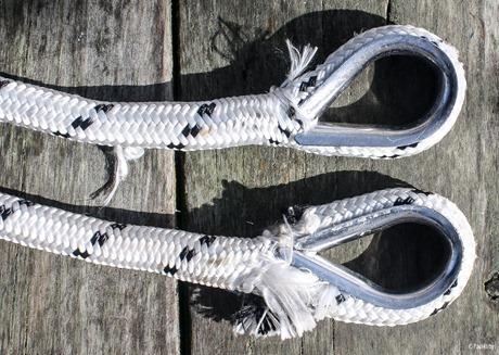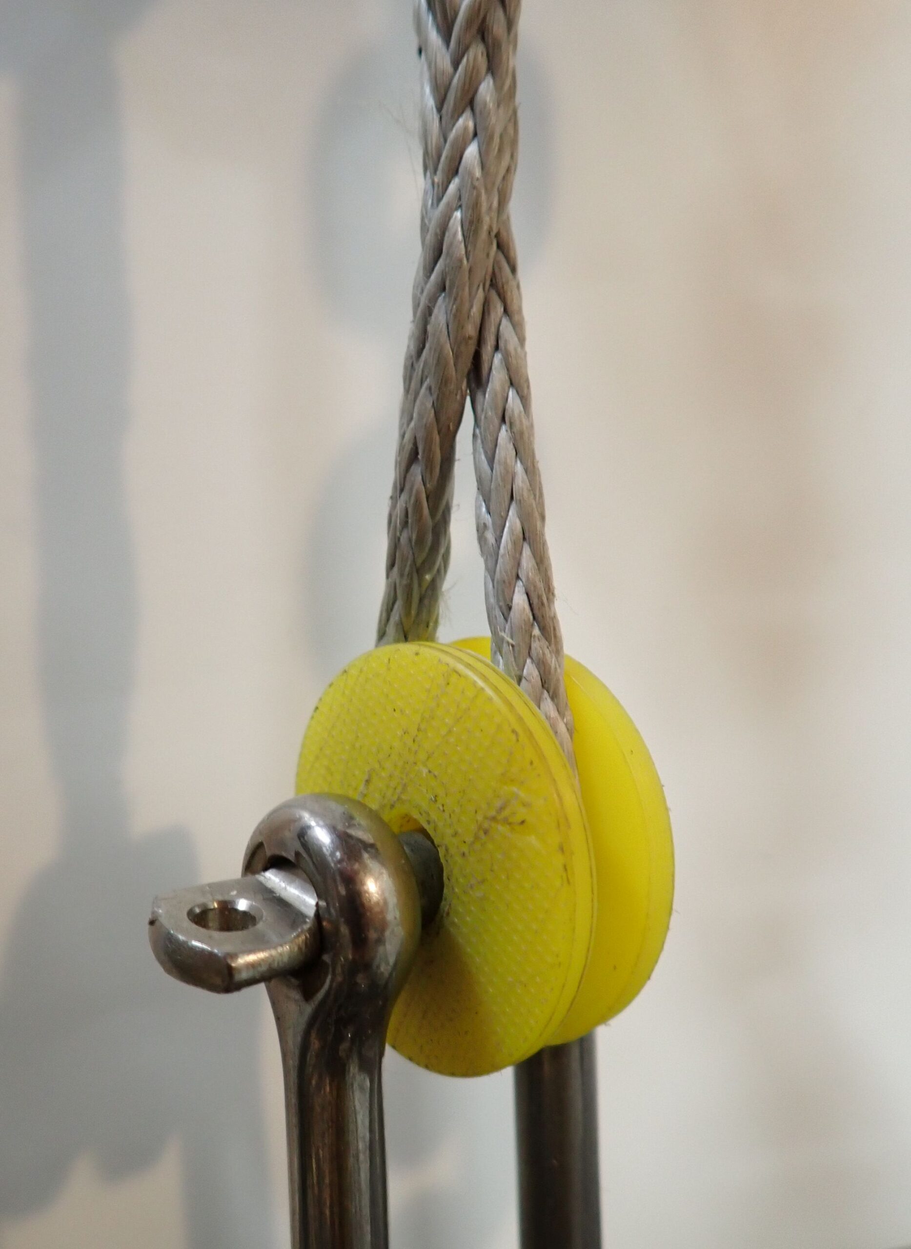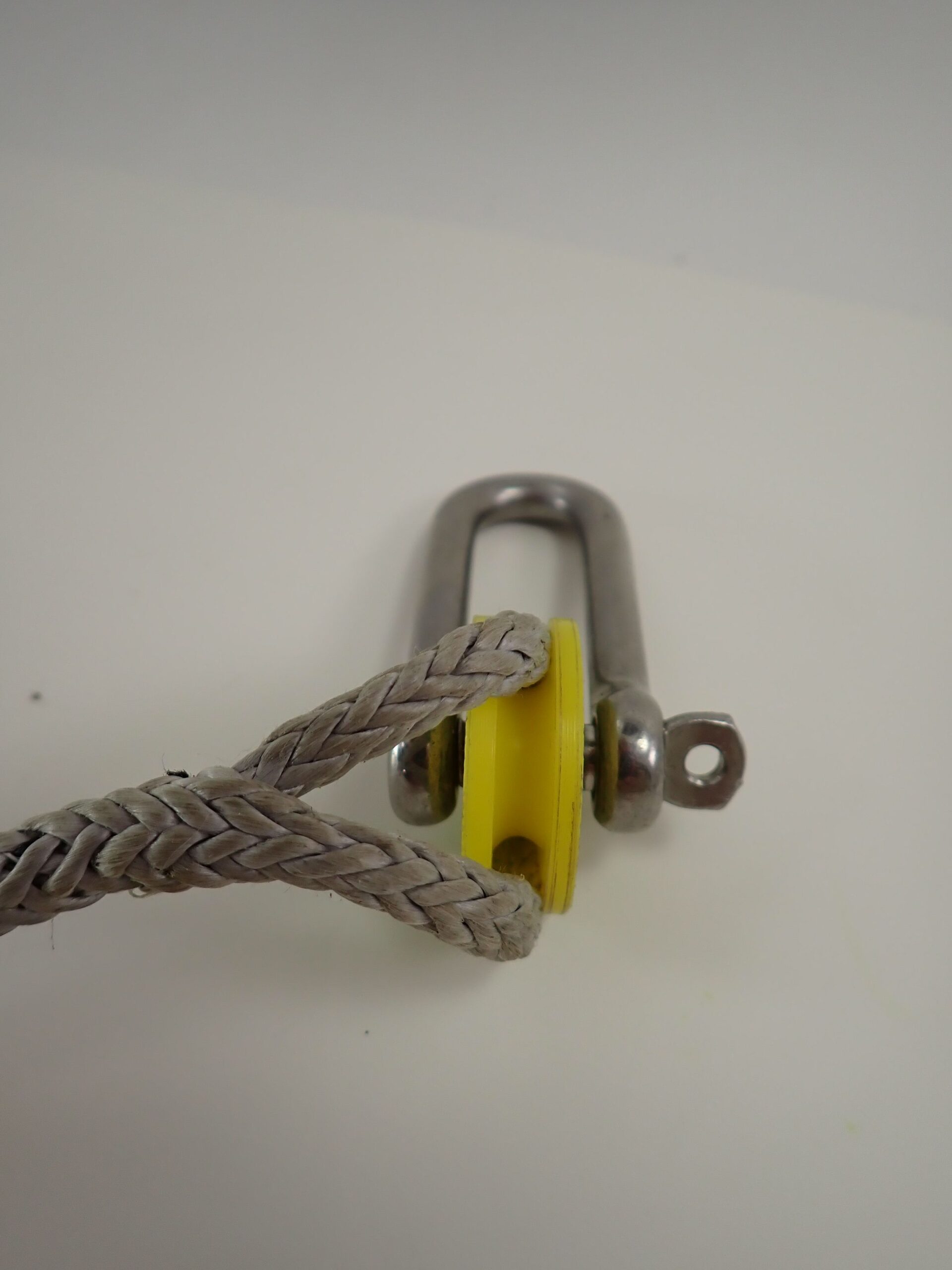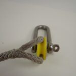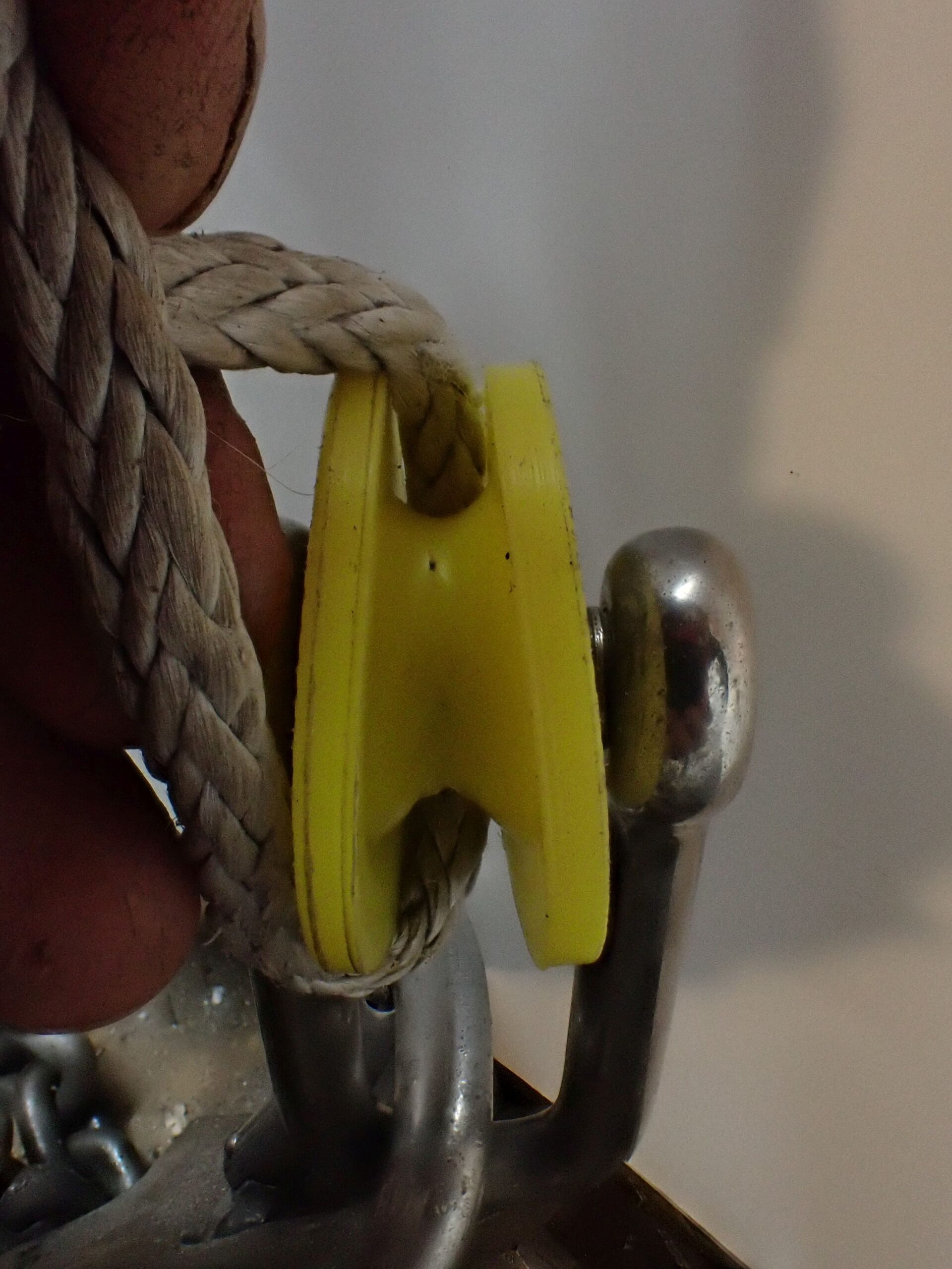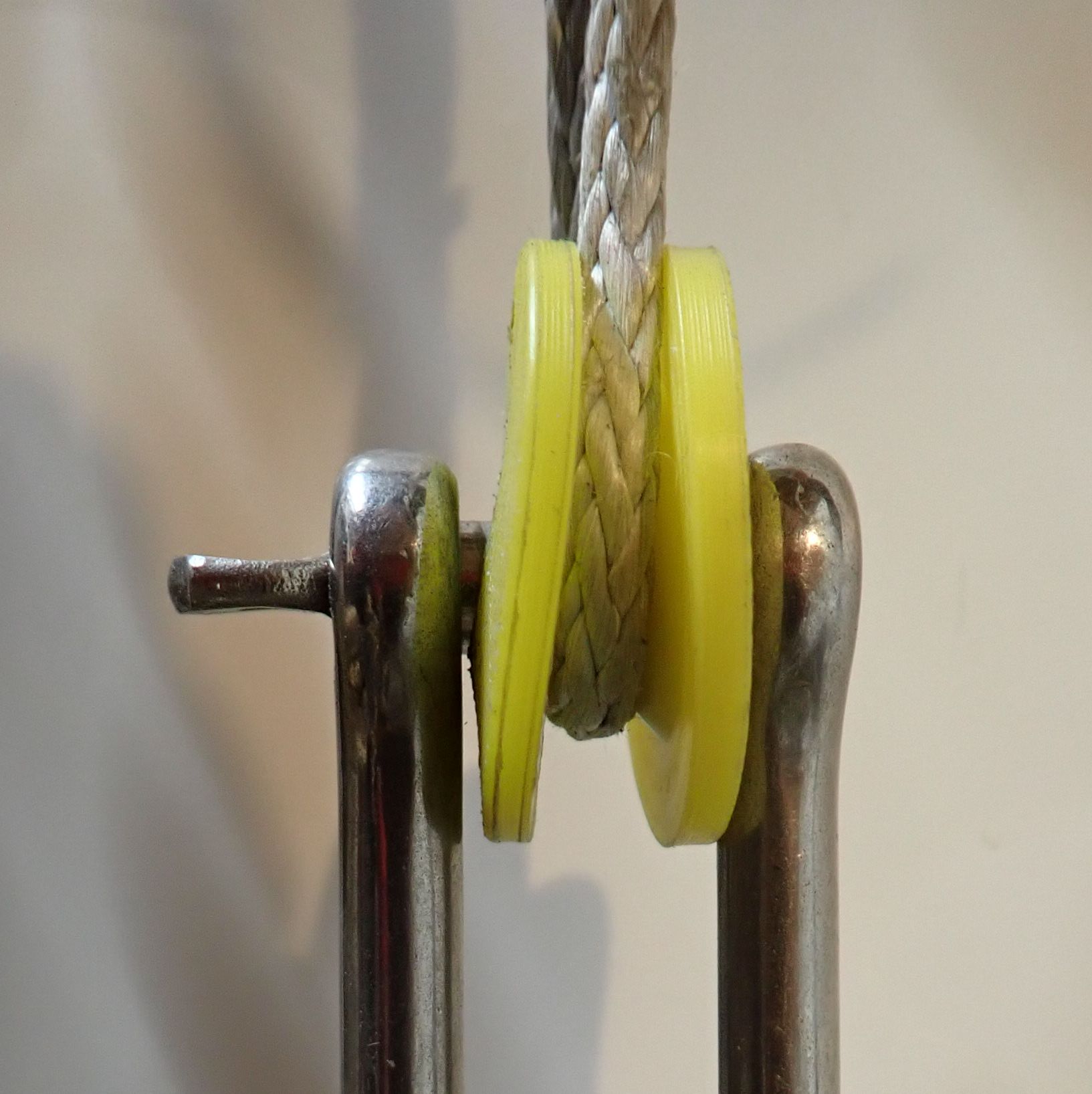 This is not a completely new concept. Spool thimbles have long been used on multi-pulley block beckets to increase the pin diameter to better suit typical sized polyester rope. But Dyneema puts a new spin on it. The rope is no longer as wide as the pin, and off center loads weaken shackles and pins, and the block or assembly may be pulled slightly crooked. If there are any sharp edges, the rope will not just contact them but be forced against them by the off-center pull.