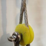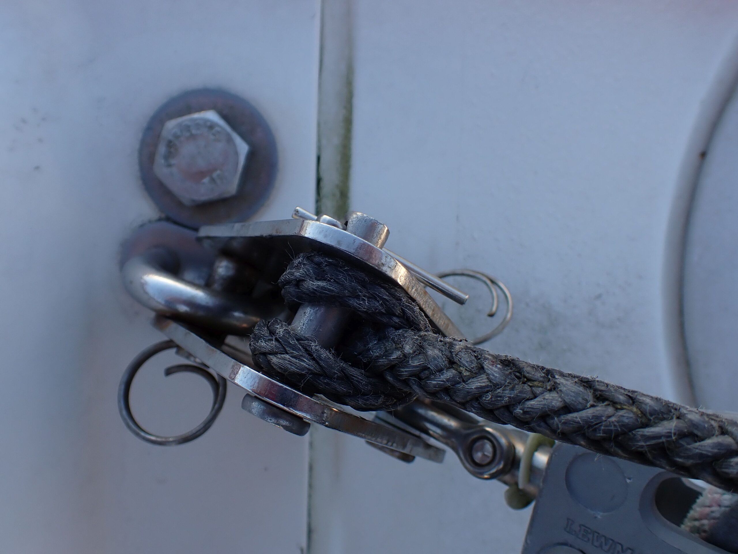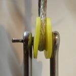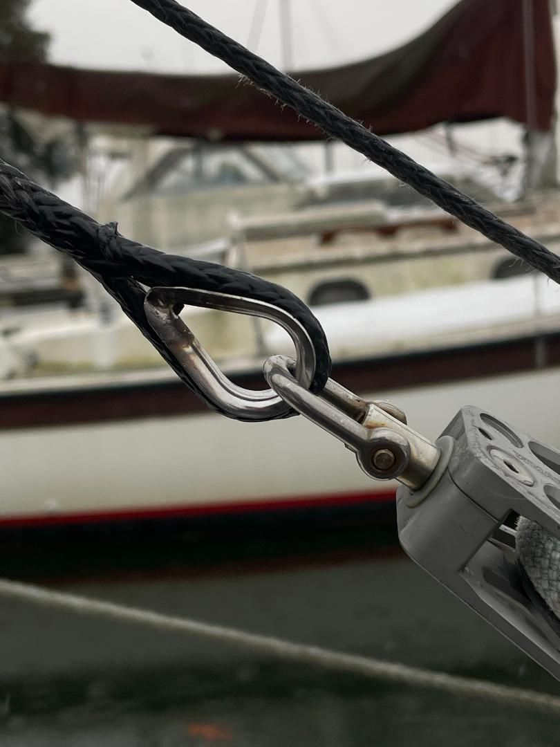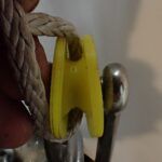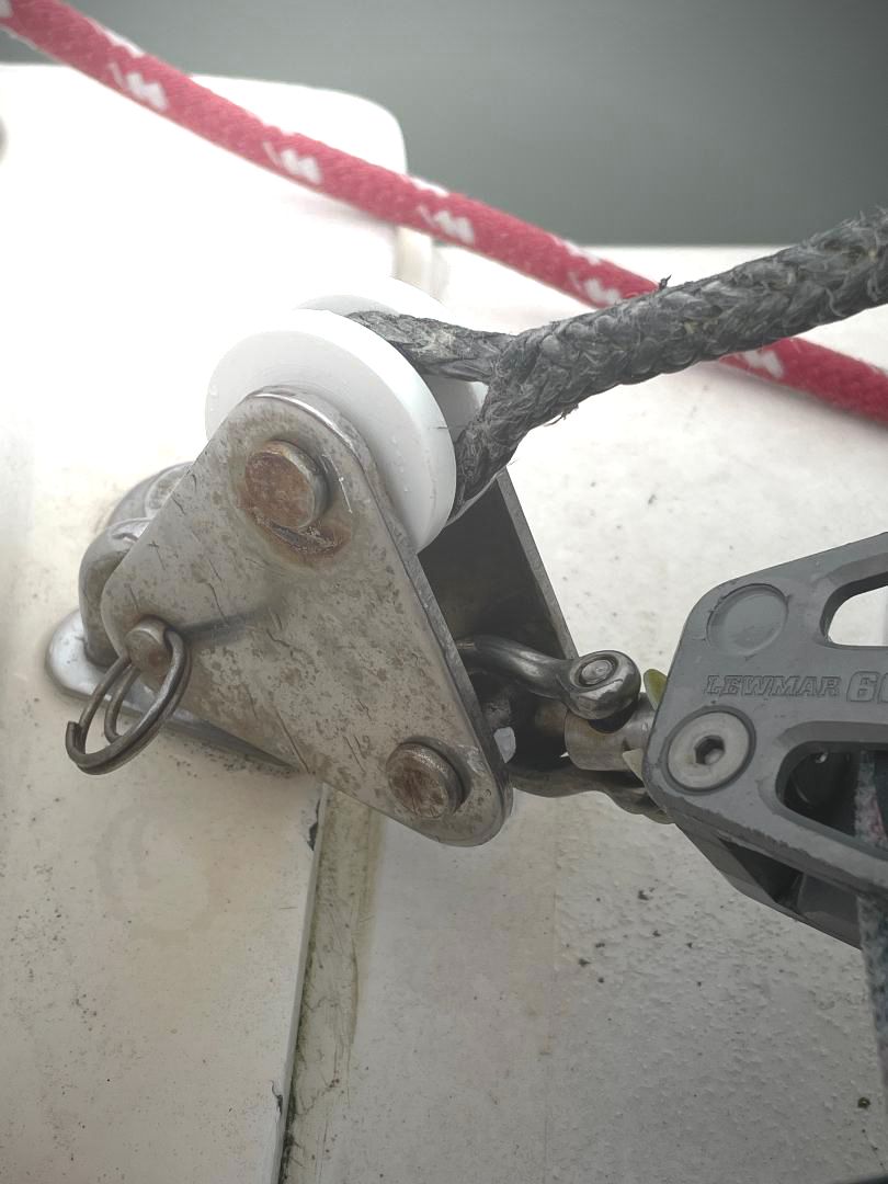 Unlike a common wire rope thimble, a wheel thimble can’t shift and damage the line. It centers the load, keeps the tackle straight, I don’t have to seize it tightly in place, and that it protects the sides of the rope from sharp side plates. Aluminum would be the most durable material, ideal for high loads and critical applications, such as standing rigging, but plastics are suitable for lower loads and non-critical applications, while having the inherent advantage of being non-chafing and low friction. The whole reason we investigated this was a chafe problem from side plates that had been an issue, even with conventional thimbles. Not anymore.