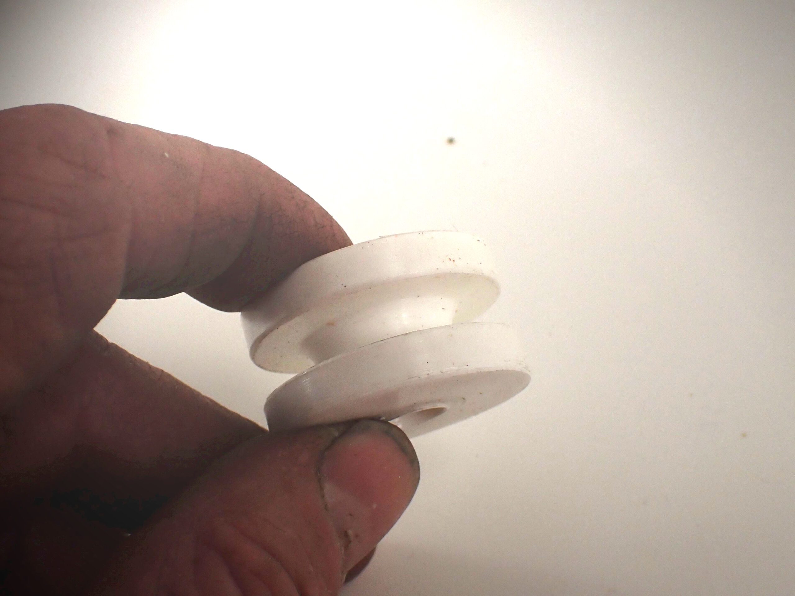 Strength. The failure point is compression under the Dyneema. We tested wheel thimbles made from HDPE, Nylon, and Delrin, using ¼-inch Dyneema and 5/16-inch pins. The