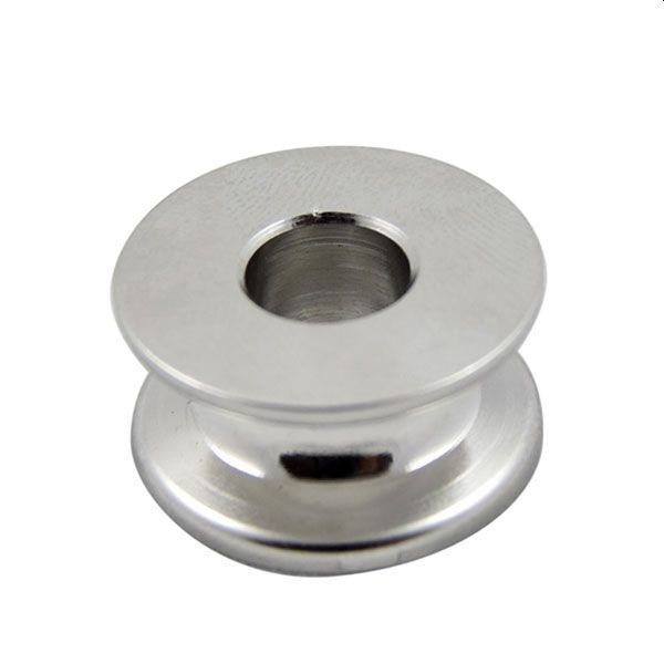Wheel thimbles for Dyneema have unique features that solve these problems. They are the full width of the pin with a distinct center groove, spreading and centering the load. The groove is deep, both to protect the sides of the eye from chafe and to help retain the eye in the thimble without the need for a tight seizing. They don’t distort or collapse under extreme load.