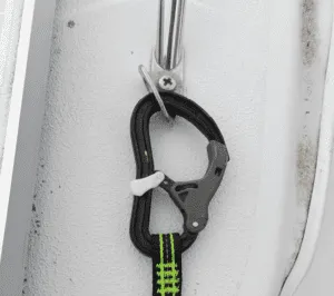 Bolt hangers can be installed anywhere there is an existing 3/8” bolt. The Kong locking carabiners found on many safety tethers are adapted from climbing gear.