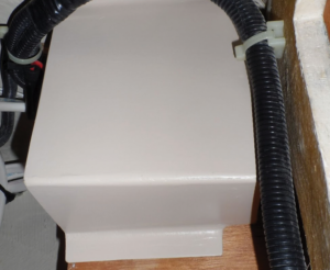 3. In just a few hours, excluding time for epoxy to cure and for paint to dry, we built a protective cover for the solenoid out of shower surround.