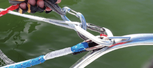 • Wire gate carabiners. Don’t use the solid gate style, which are prone to corrosion problems in the hinge and inside the gate. Locking carabiners also have corrosion problems, unless you commit to a regular maintenance program. But the simple wire gate carabiners are several times lighter than clunky stainless steel marine versions, stronger in similar sizes, and have a much smoother and snag-free action clipping and unclipping. Although they may not last as long as an all-stainless carabiner, they are far more pleasant to use, light enough not to ding the gelcoat, and several times cheaper.