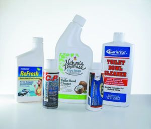 The majority of grocery store toilet bowl cleaners contain bactericides that inhibit bacterial activity in the holding tank and contribute to bad smells. These same chemicals attack the head pump and hose materials, shortening their lives and increasing permeation. There are a handful of eco-friendly and septic-friendly products that work, but you’ll need to read the MSDS sheets and check them against out list of damaging ingredients to be certain.