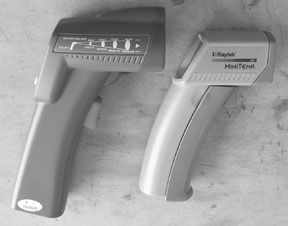 We looked at a pair of portable battery-powered units: one from Raytek, the MT4 Mini-Temp; and one from Telatemp, the High-Value IR Thermometer, model number 42529. Both are trigger-activated, pistol-grip units. Features common to both units include backlit LCD displays, laser sighting, and a 6:1 field of view, and both run on a 9-volt battery.