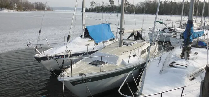 Southern sailors often put their boats away for a few months when the water gets a little cool. Northern sailors have a more definitive reason; they put their boats away when the water gets hard. Often, freezing is limited to harbor areas, where shallow water, freshwater input, and limited tidal flushing encourage ice formation. Far north, you can walk on it for weeks, while in the mid-Atlantic, the layer is often thin and transitory. And while a few inches of ice are generally harmless to a sound boat, thick moving ice can damage paint, exposed steering gear, and planking. Although we can’t make the weather any warmer, there are measures boat owners can take to keep ice at bay.