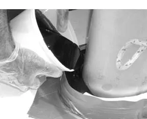 Enter the liquid mast wedge: Since 1993, Spartite™ has been on the market for both chocking the mast and sealing the mast hole. Spartite, made by CASS Polymers of Michigan, is a two-part pre-polymer (similar to a urethane) that you mix and pour between the mast and the mast collar. Once it cures, its low shrinkage (0.001″ per inch) and the resiliency (Shore hardness 60D) chocks the mast in place.