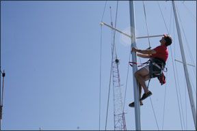 Not surprisingly, some of the better equipment and instruction for climbing a mast come from mountaineering sources. As riggers like Toss have long known, the gear and techniques used in making vertical ascents up rock faces or trees can be applied to climbing masts, too. Many of the tools and techniques Toss discusses in his excellent instructional video, “Going Aloft” (www.briontoss.com), are adapted from mountain-rescue climbing. If you have any doubts about going aloft, the video is an excellent primer. It has not yet cured my bad case of Elvis leg, but as far as I know, there is no other resource that does a better job of introducing sailors to the challenges of working aloft.