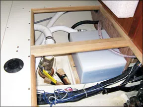 In the picture (at left), you will see the tank mounted just aft and to port of the shaft log on our Hunter 30. The tank inlet is connected to a fill tube, the outlet
